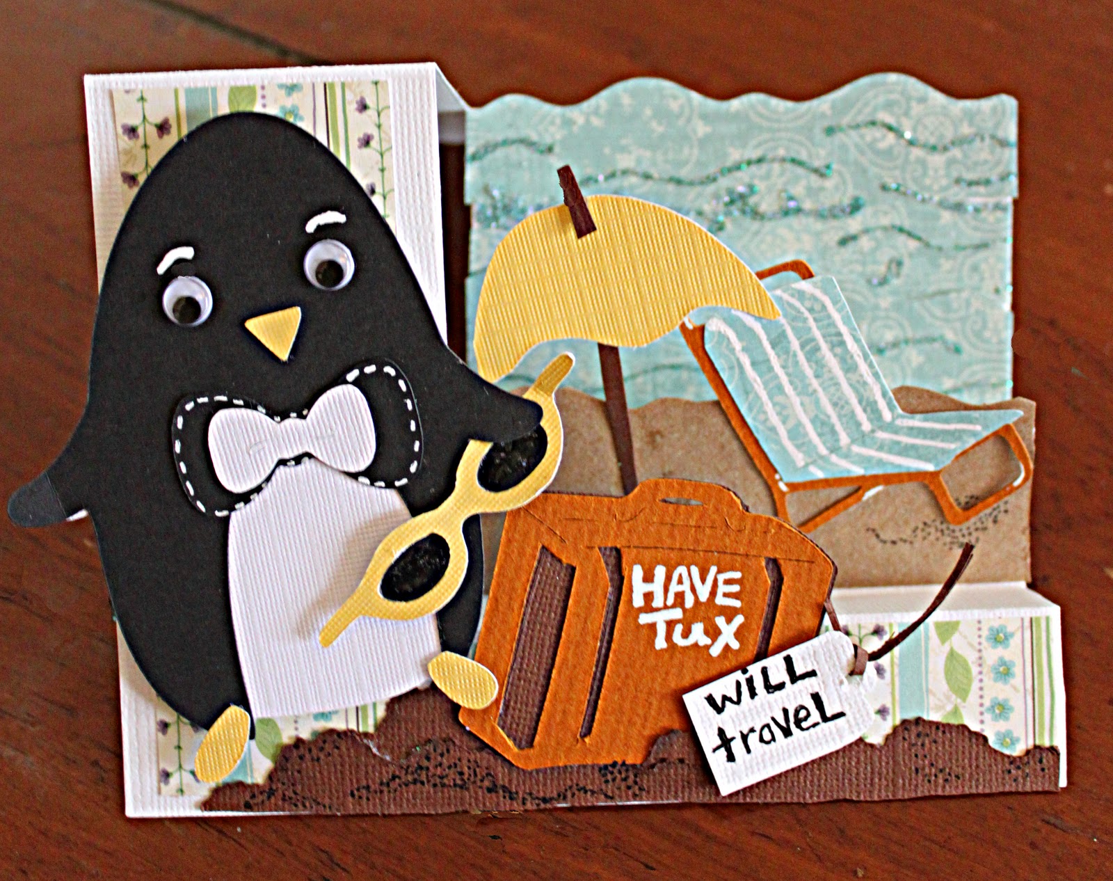 First of all, this card is just fabulous--I LOVE the sentiment--hahah! Have Tux will travel...how did you even THINK of that? It's awesome!